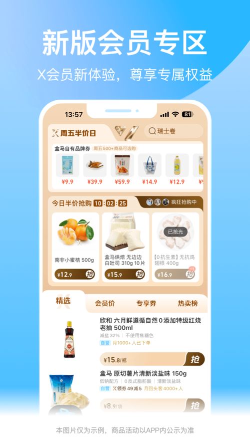 盒马鲜生app经常举办各种优惠活动,让你在享受美食的同时,还能省钱。比如,满减、优惠券、限时抢购等,让你在购物过程中,感受到满满的实惠。此外,盒马鲜生还推出了会员制度,会员可以享受更多优惠和专属服务。