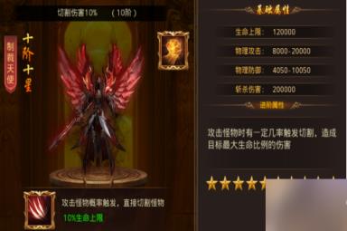 制裁系统:可以增加玩家生命上限,物理攻击,物理防御的基础属性和斩杀伤害,斩杀伤害满级时高达二十万,制裁天使的属性是攻击怪物时有一定几率触发切割,造成目标最大生命比例的伤害,进阶制裁天使可以增加目标最大生命比例的伤害,制裁天使附带的被动技能激活后可使切割触发概率提升1.5倍。