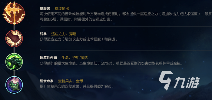 不管是选择暴击流还是一刀流,在符文上都是没有根本改变的,全部都选择主系征服者为主,剩下的小天赋点风暴聚集、适应性外壳、甜食专家,尤其是一刀流出装一定要点甜食专家,对暴击流来说可以换成猎人,因为当饮血剑出来之后就不需要果子了。
