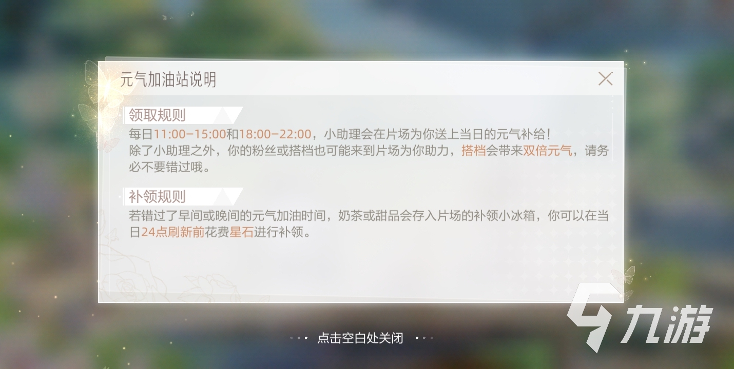 加油站并不是随时都能为玩家补充元气的,它是有一个领取的时间限制,每天有两次领取的机会,第一次在11:00-15:00之间,第二次在18:00-22:00之间,在领取时间范围内,玩家随时都可以补充当日的元气,另外,如果玩家粉丝比较多的话,还会触发粉丝助力,这个时候玩家就能领取双倍的元气的,也就是70点元气。