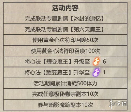 活动期间达成以下条件即可获得联动限定心法[耀变魔王]与[潸然落雪]、黄金心法符印、飞雪令经验、绝品极秘卷宗等丰厚奖励!