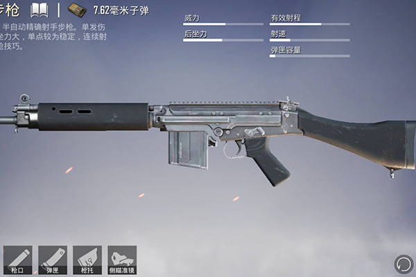 SLR射手步枪使用7.62mm子弹,单发伤害高且较为稳定,但是枪械本身后坐力大,连续射击需要较强的压枪技巧,所以SLR要求有较强的操控性。推荐配件为:消音器,4倍镜,快速扩容,托腮板。