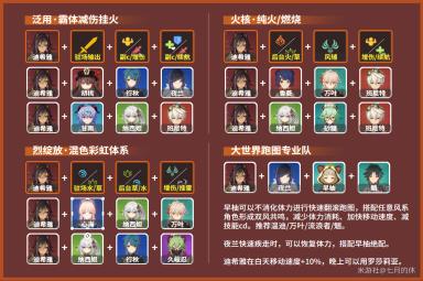 纯火队:迪希雅+香菱+班尼特+万叶等,或搭配任意前台火c:可莉+迪希雅(辅)+班尼特+万叶等。无万叶可以用砂糖等风系角色替代,下面风系同理替代。