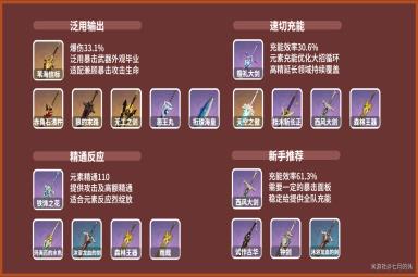 4命以下,可以选择充能向武器,来提升大招的循环,4命以上建议还是选择输出向武器,充能就用圣遗物副词堆就差不多够用了。