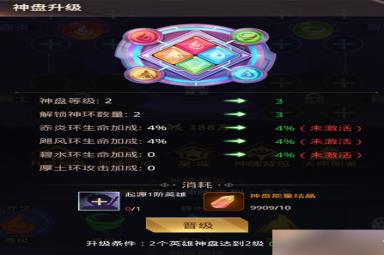 当神盘等级升级到3级/4级时,还需要满足有2个英雄神盘达到2级/有3个英雄神盘达到3级的要求。