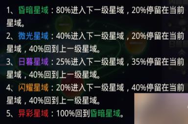 初始在昏暗星域中开始探索,每次探索后,会从当前星域获取奖励,获取奖励后根据概率有机会进入下个品质的星域、停留在当前星域、回退到上一个星域。