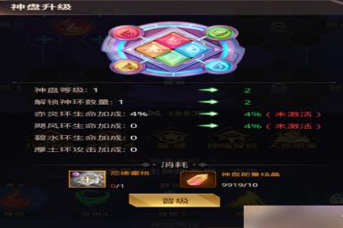 消耗英雄本体和神盘能量结晶可对神盘进行升级,升级后神环获得生命、攻击加成。